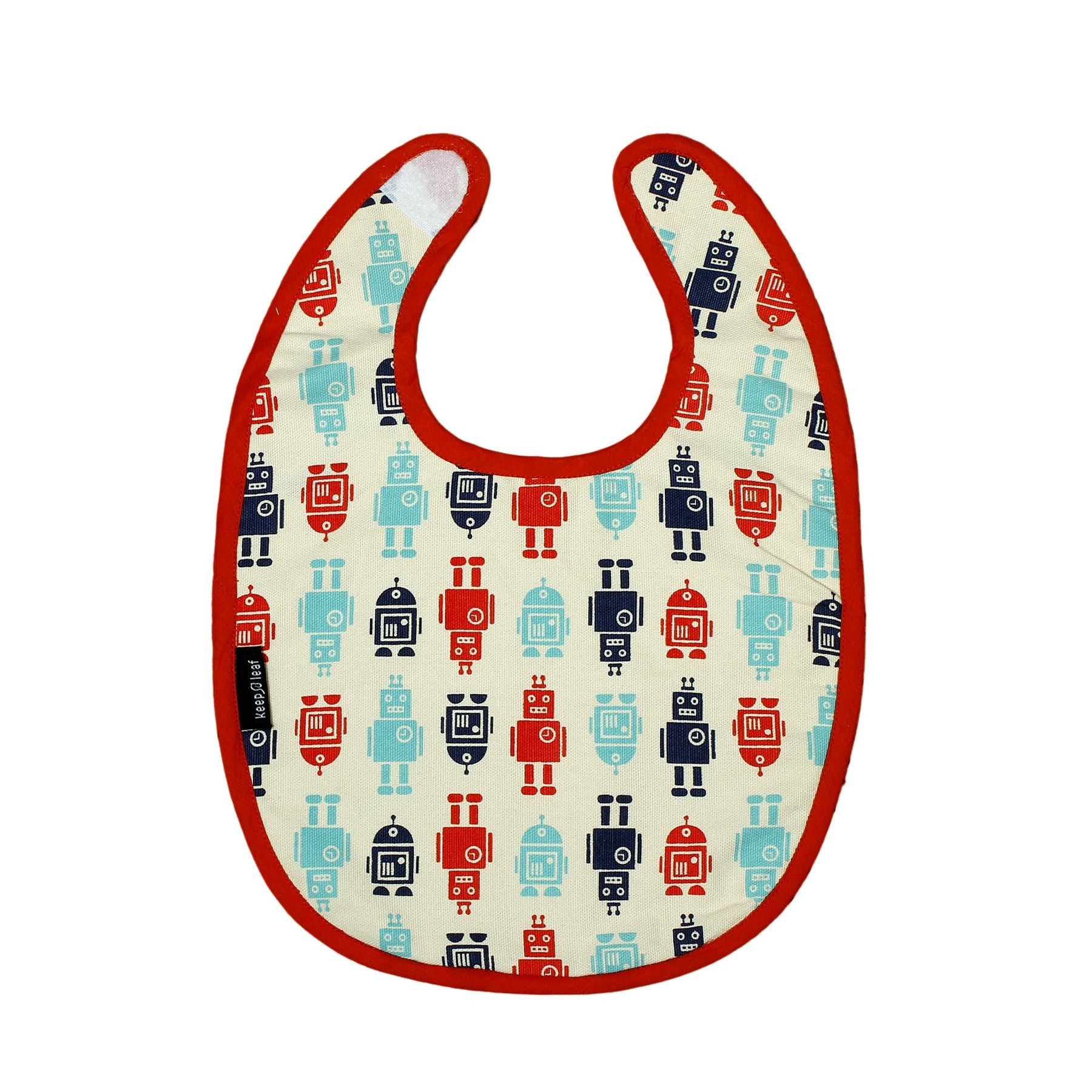 One side is made from 100% organic cotton and handy waterproof coating, featuring a fun robots pattern, while the other side features a plush velour lining for extra comfort. It also has an easy, secure velcro fastening.